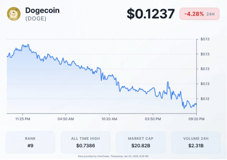 Beim Schreiben betrug der Handelspreis von Dogecoin 0,1237 USD und ist in den letzten 24 Stunden um 4,28 % gefallen.