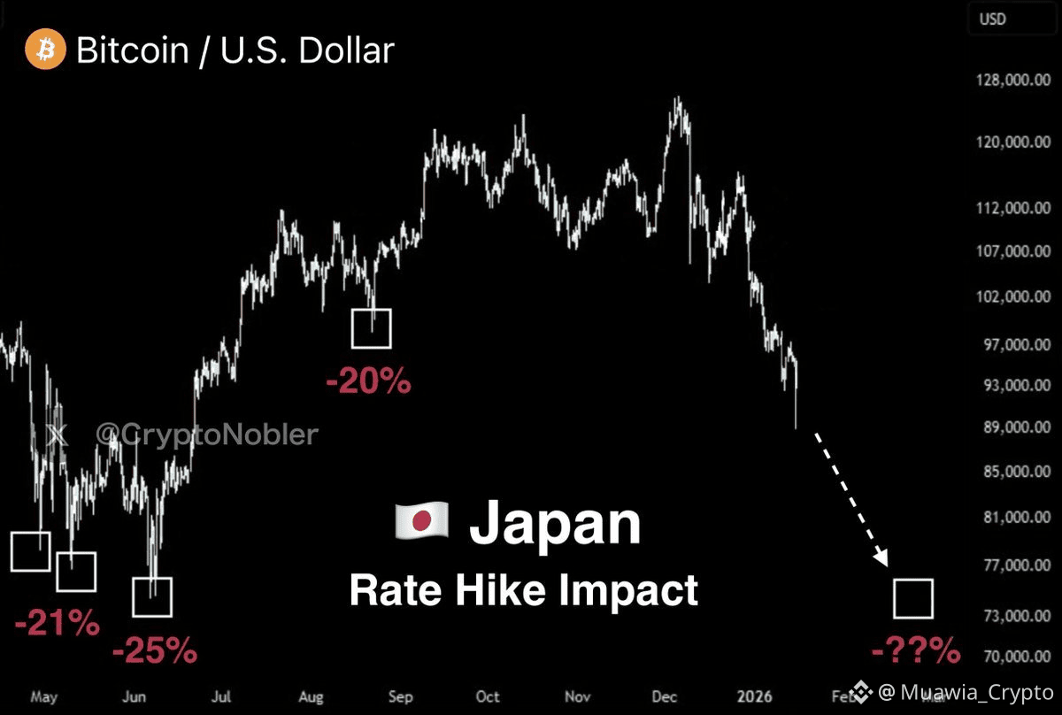 Across multiple rate-hike events from the Bank of Japan, Bitcoin has consistently suffered 20–25% drawdowns in the days and weeks that followed.