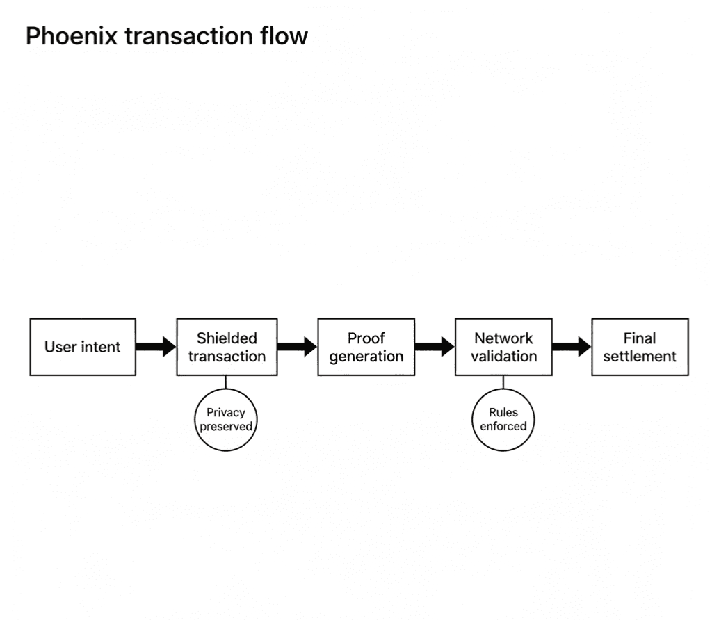 Transaktionen im Netzwerk können standardmäßig privat sein. Salden müssen nicht öffentlich sein. Der Zustand des Vertrags kann verborgen bleiben. Doch das Netzwerk weiß immer noch, dass alles gültig ist.