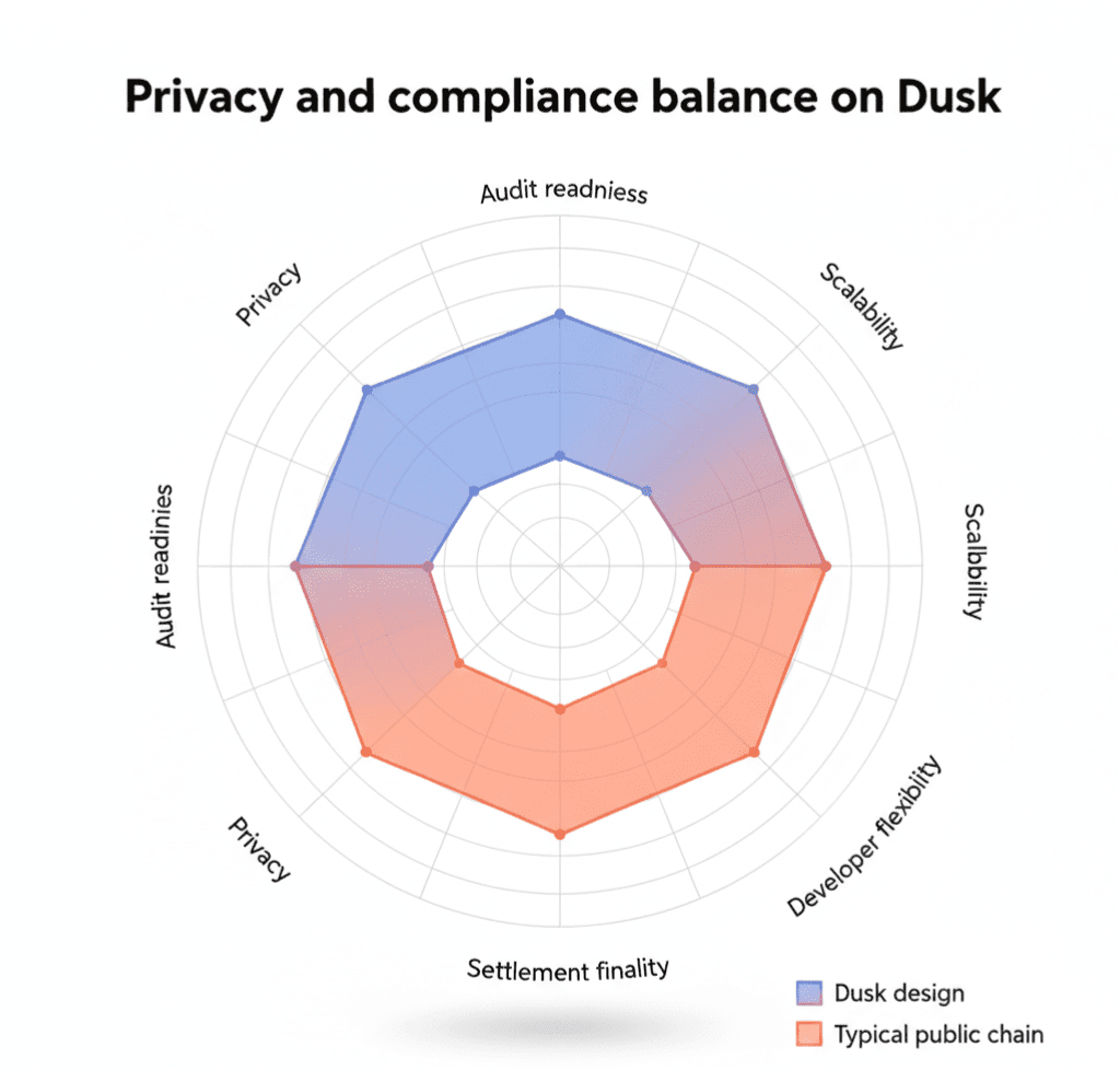 Systeme, die alles offenlegen, werden mit Datenschutzgesetzen zu kämpfen haben. Systeme, die alles verstecken, werden mit Vorschriften kämpfen. DUSK sitzt in der Mitte mit einem ausgewogenen Ansatz, der realistisch erscheint.
