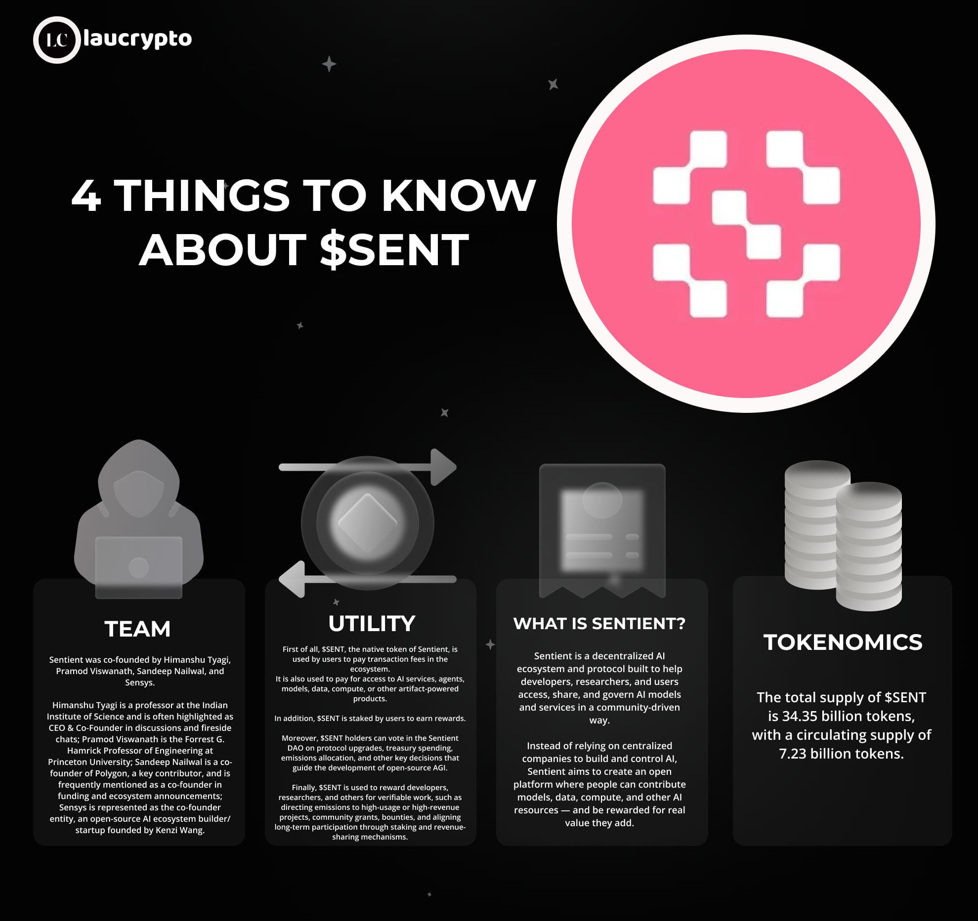 $SENT é o token nativo do Sentient, um ecossistema e protocolo de IA descentralizado construído para ajudar desenvolvedores, pesquisadores e usuários a acessar, compartilhar e governar modelos e serviços de IA de forma comunitária.