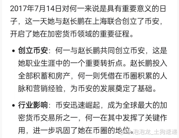 币安迅速崛起,成为全球最大的加密货币交易所之一,何一在其中发挥了关键作用,进一步巩固了她在币圈的地位。这次创业不仅是何一职业发展的重要里程碑,也使她在金融科技行业中获得了广泛认可,巩固了她“币圈一姐”的称号。