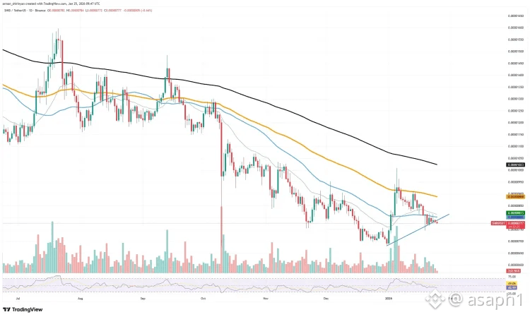 Actualmente cotiza cerca de los $0,00000776, y aunque los repuntes han sido breves, el ecosistema está demostrando una resiliencia que muchos no esperaban. El capital entra por ráfagas, pero falta ese despliegue constante para que el motor arranque de verdad. Estamos en esa calma tensa donde cualquier chispa de capital nuevo podría cambiar la narrativa por completo.