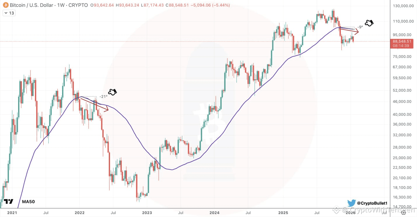 Bitcoin is closing its 11th straight weekly candle below the 50-Week MA — and for the first time since Feb 2022, that moving average is sloping downward 📉