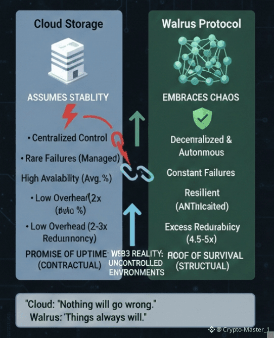Decentralized storage versus cloud storage. New system versus old giant. The usual story. It didn’t hold for more than a few minutes. The deeper I went, the clearer it became that Walrus isn’t really arguing with AWS or Google Cloud at all. It’s arguing with a belief most infrastructure quietly depends on: that failure is rare, manageable, and mostly someone else’s problem.