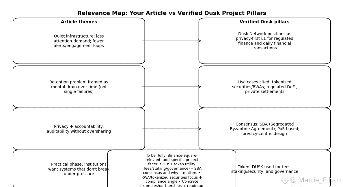 Dusk’s architecture reflects a different philosophy. It doesn’t need to grab attention. It doesn’t offer flashy alerts or gimmicks. It quietly does what it’s built to do: settle transactions, execute contracts, and protect sensitive data. Over time, users realize they don’t need to check it constantly. The system just works.