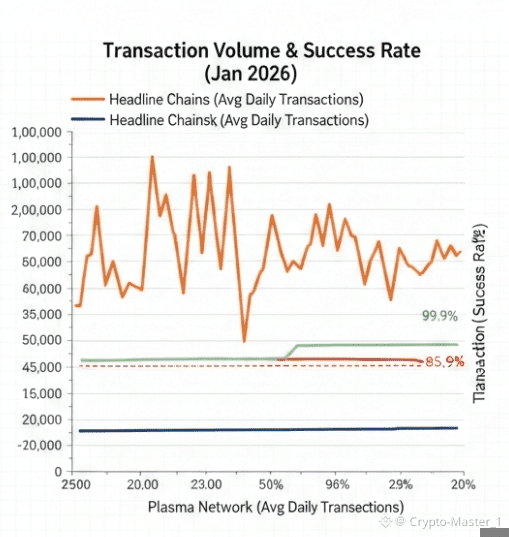What struck me is how intentionally Plasma resists trader-driven feedback loops. There are no constant parameter tweaks to chase volume. No incentives designed to spike short-term activity. The network is comfortable letting usage grow quietly. As of January 2026, Plasma’s average daily transaction count sits well below headline chains, but its transaction success rate consistently clears 99.9 percent. That number sounds abstract until you realize what it implies: almost no operational noise.