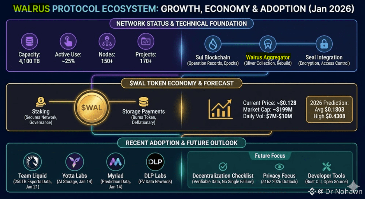 The WAL token plays a central economic role in this system. Node operators and delegators stake WAL to determine participation in each epoch’s committee, while users pay storage fees in $WAL. Stakers earn rewards from network activity, aligning security with long term participation. As of January 2026, WAL trades around $0.128, with a market capitalization near $199 million and daily trading volume ranging between $7 million and $10 million. Forecasts for 2026 suggest an average price of $0.1803 and a potential high of $0.4308, reflecting expected ecosystem growth. A deflationary mechanism burns a portion of WAL used in storage transactions, directly linking increased adoption of verifiable storage to reduced token supply.