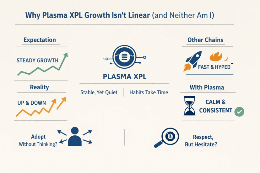 Tron fühlt sich beschäftigt an. Solana fühlt sich lebendig an. L2s fühlen sich ehrgeizig an. Plasma fühlt sich reserviert, fast zögerlich an. Als ob es darauf wartet, dass die Welt entscheidet, dass sie tatsächlich langweilige Geldschienen möchte – deshalb ist sein Wachstum nicht linear. Ich wachse auch nicht so. Ich komme zurück. Ich mache eine Pause. Ich gehe leise voran.