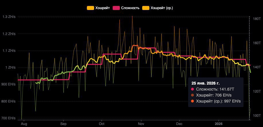 🌪🇺🇸Ein schwerer Wintersturm in den USA hat ~200 EH/s an Mining-Leistung außer Gefecht gesetzt und die Hashrate von Bitcoin auf 706 EH/s gesenkt, den niedrigsten Stand seit sechs Monaten. Die Blockzeiten dehnten sich kurzzeitig auf ~12 Minuten aus.