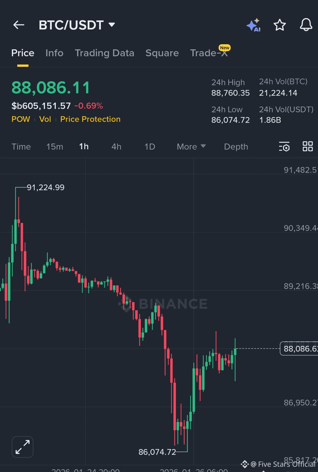 $BTC BTC is currently trading near 88,000, which places price in no-man’s land—neither at a strong demand zone nor at a key resistance. The most important level to watch sits lower, around 85,800–85,000, a demand area that has held before but is now under increasing pressure.