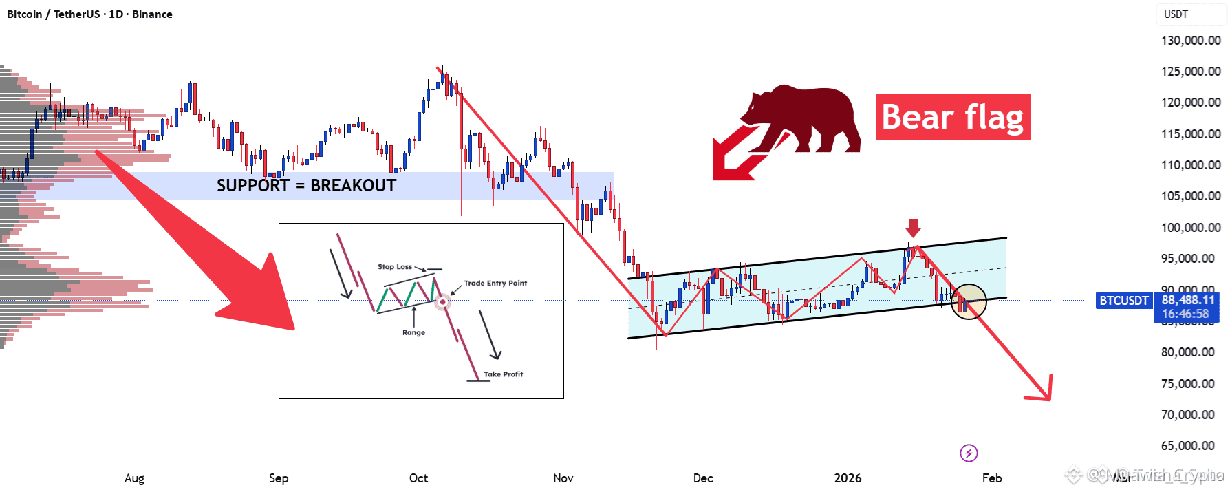 The current structure resembles a textbook Bear Flag formation following an aggressive sell-side impulse — historically a high-probability continuation setup when confirmed by weakening participation and macro headwinds.