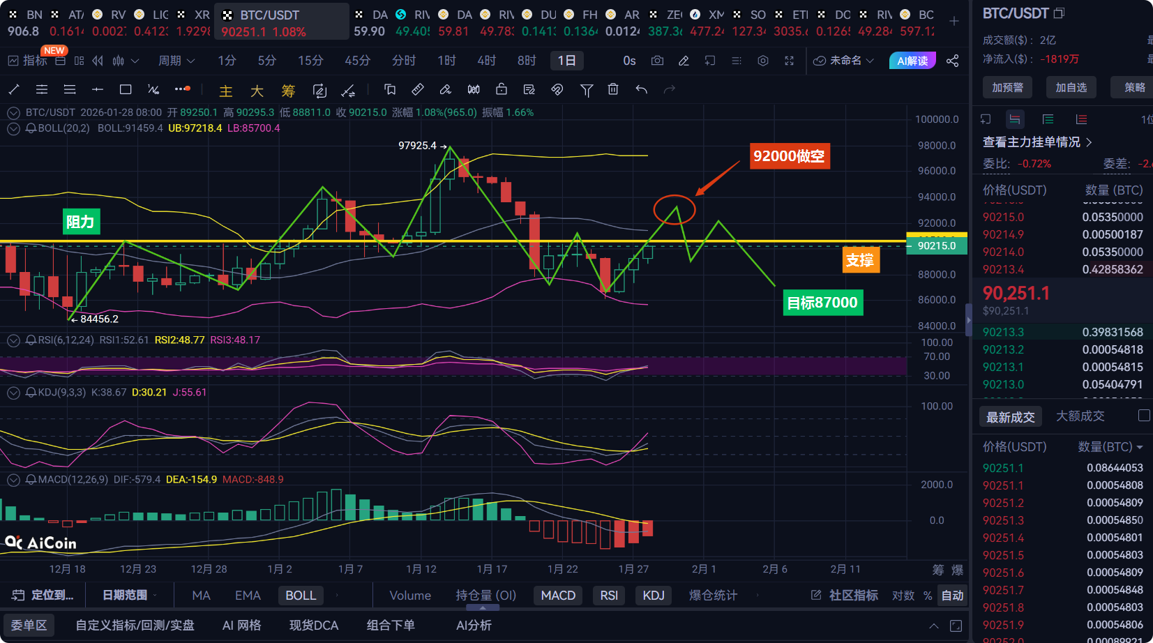 Ich erzähle euch von einem Fall aus dem letzten Jahr: Im Dezember letzten Jahres schwankte BTC eine ganze Woche lang im Bereich von 85000-90000, viele Fans waren damals sehr nervös, entweder kauften sie teuer und wurden gefangen, oder sie schnitten ihre Verluste und verpassten den Zug. Ich habe damals in der Community immer wieder betont: „Unterstützungsniveau niedrig kaufen, Widerstandsniveau hoch verkaufen“, und habe die Leute ermutigt, bei etwa 87000 schrittweise einzusteigen und bei etwa 92000 zu reduzieren. Am Ende haben viele in der Schwankungsphase 15% Gewinn gemacht. Die aktuelle Marktsituation ist der von damals sehr ähnlich: Oben ist 92000 ein oft getestetes Widerstandsniveau (im Bild markiert mit „92000 short“), unten ist 87000 die entscheidende Unterstützung (im Bild grün „Ziel 87000“). Solange wir diesen Bereich nicht durchbrechen, sollten wir nach der Schwankungsstrategie handeln.