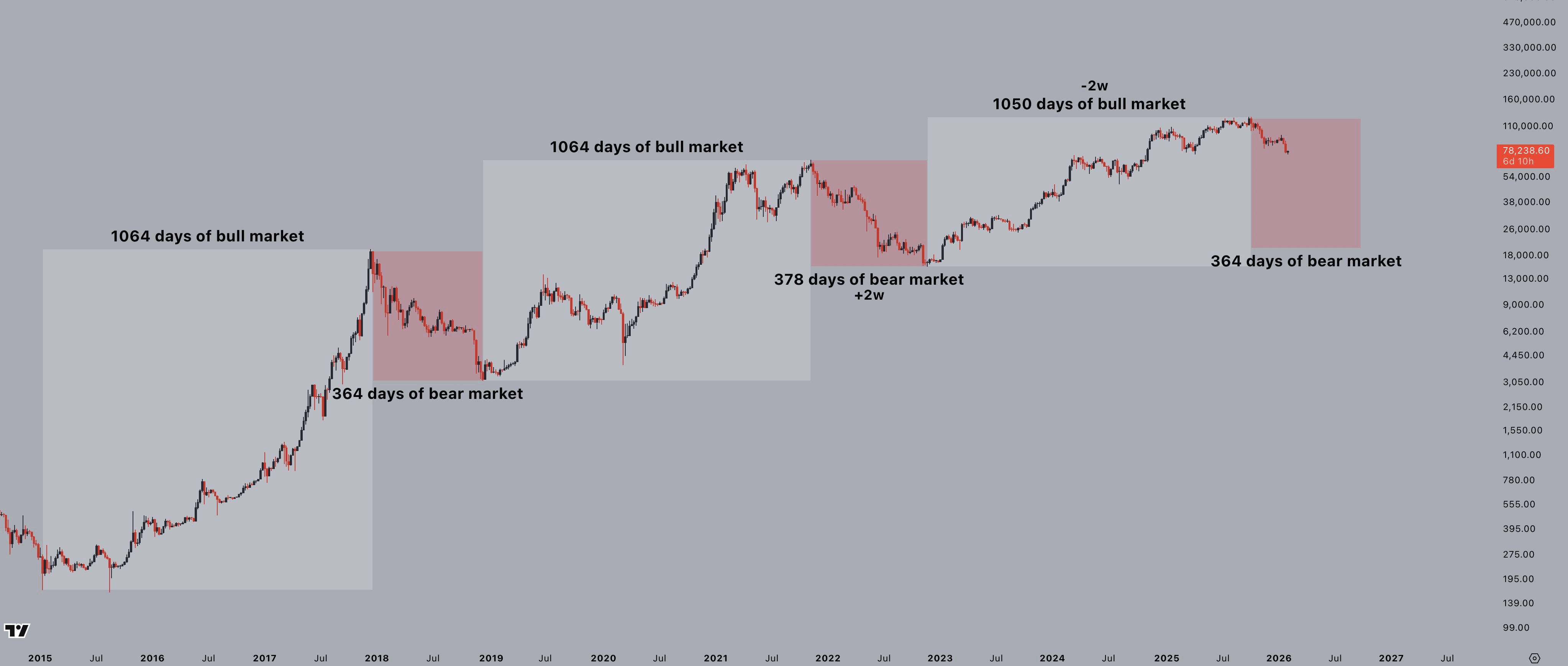 In der volatilen Welt der Kryptowährung wurden die Preisbewegungen von Bitcoin lange durch die Linse wiederkehrender Muster untersucht, insbesondere des sogenannten 4-Jahres-Zyklus, der mit seinen Halbierungsereignissen verbunden ist. Das Diagramm zeigt, dass dieses Muster bis 2026 anhält und dabei verlängerte Bullen- und Bärenphasen mit bemerkenswerter Konsistenz hervorhebt: 1064-tägige Bullenmärkte, die 364-tägige Bärenperioden umrahmen, mit leichten Abweichungen in den letzten Zyklen (ein 378-tägiger Bärenmarkt, 2 Wochen länger, und ein 1050-tägiger Bullenmarkt, der 2 Wochen früher eintritt). Die begleitende Notiz betont, dass "das Muster des 4-Jahres-Zyklus weiterhin intakt ist" und eine genaue Beobachtung angesichts der anhaltenden Schwankungen von Bitcoin erfordert.
