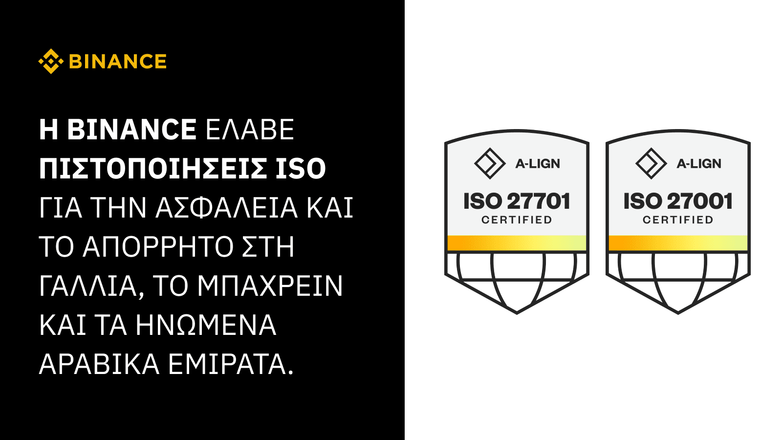Η A-LIGN, ο εξωτερικός ελεγκτής, – ένας συνεργάτης ασφάλειας και συμμόρφωσης που βασίζεται στην τεχνολογία και τον οποίο εμπιστεύονται περισσότεροι από 4000 παγκόσμιοι οργανισμοί για να συμβάλει στον περιορισμό των κινδύνων κυβερνοασφάλειας, – απένειμε τις δύο πιστοποιήσεις ISO στην Binance μετά από ενδελεχή και ολοκληρωμένη αξιολόγηση των τομέων ασφάλειας και προστασίας απορρήτου των λειτουργιών της.