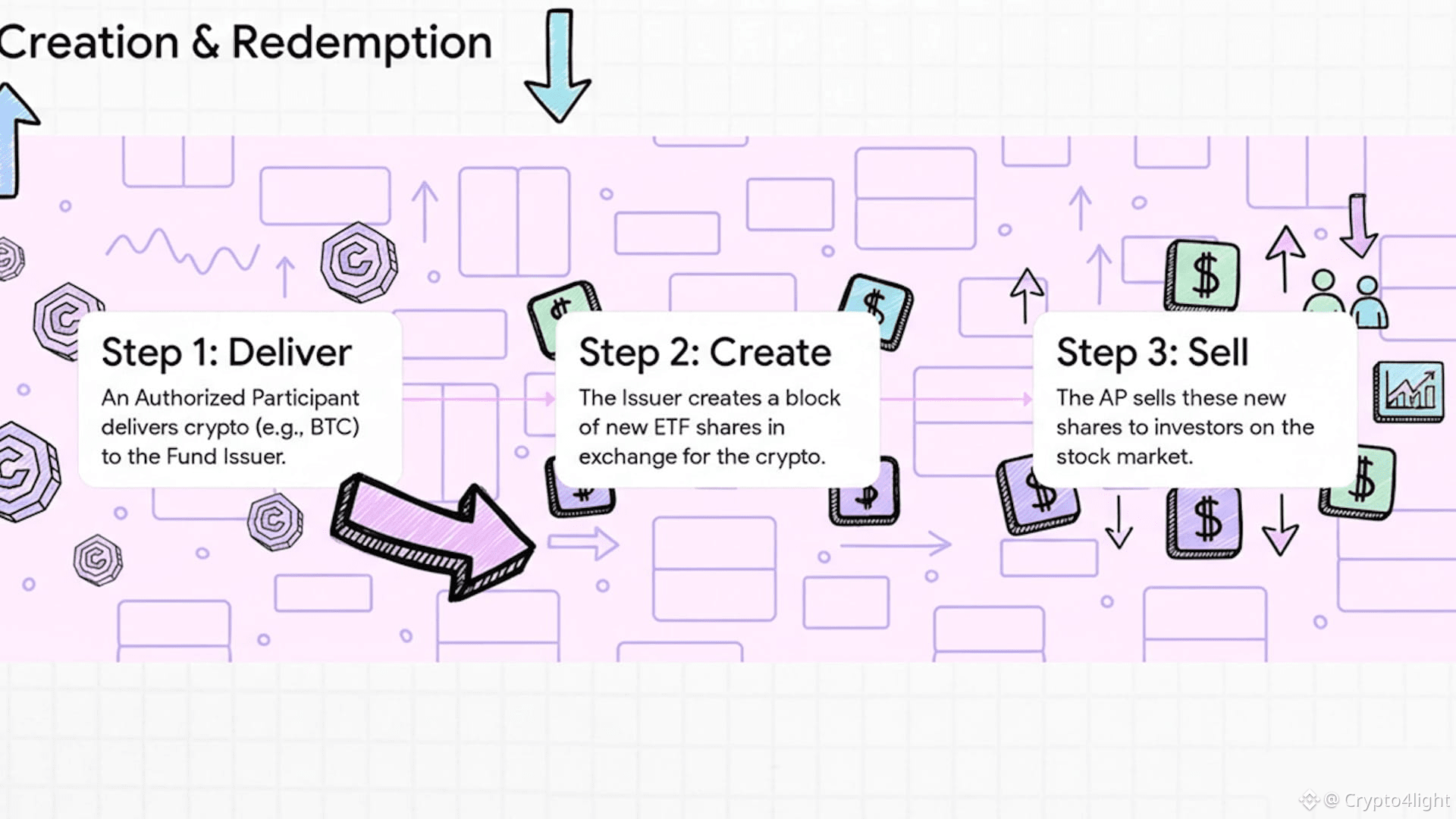 Authorized participants (large institutions or market makers) deliver Bitcoin or another crypto to the fund in exchange for big blocks of new ETF shares, called creation units.