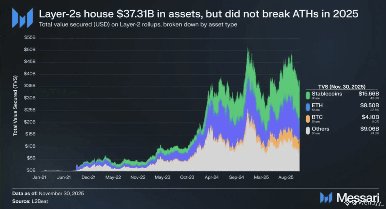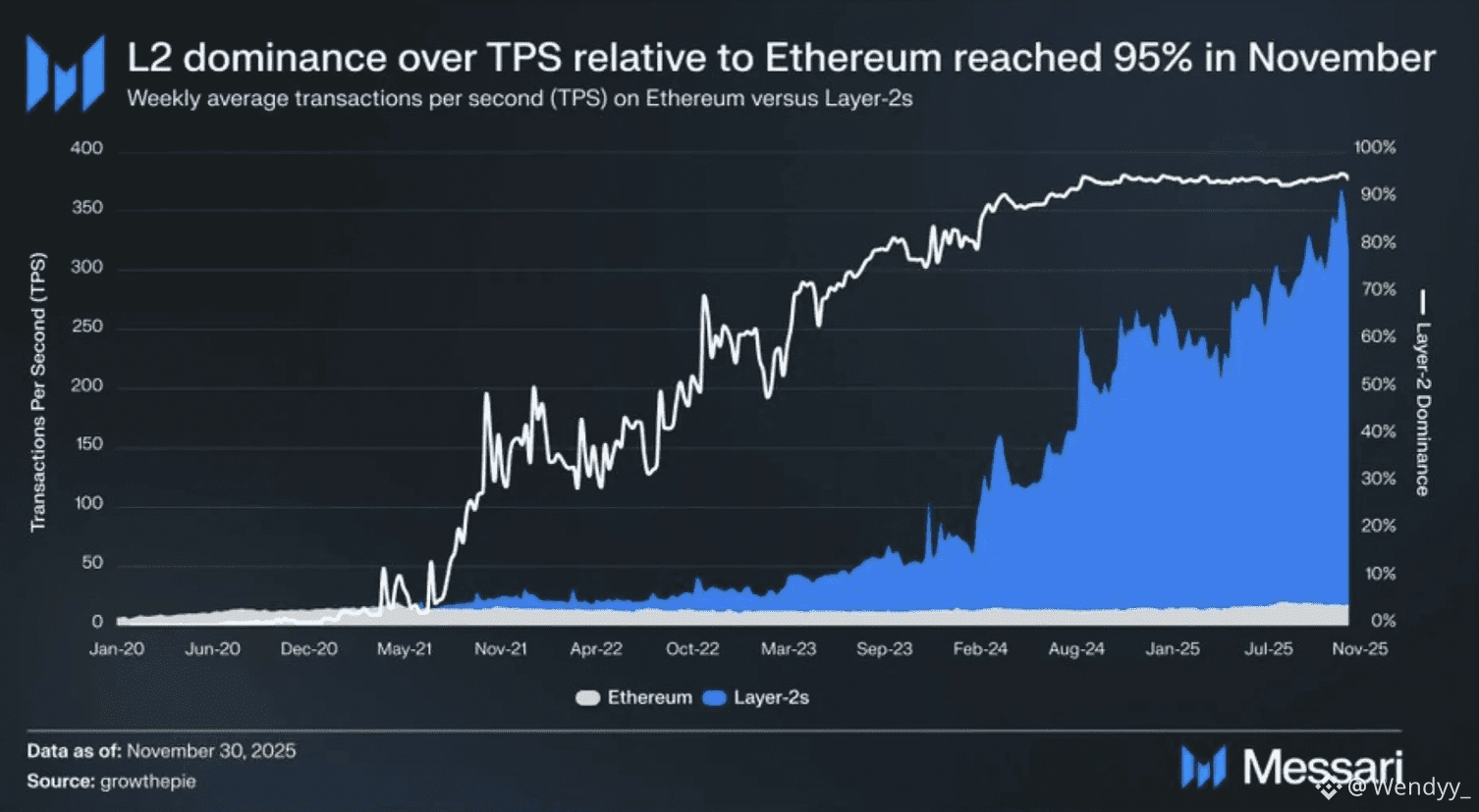 These changes reshaped on-chain reality. By November 2025, Layer 2 networks accounted for roughly 95% of Ethereum’s total transaction throughput. Average system-wide TPS climbed from about 50 in 2023 to more than 325 in 2025. Capital followed usage, with over $37 billion in assets now residing on rollups.