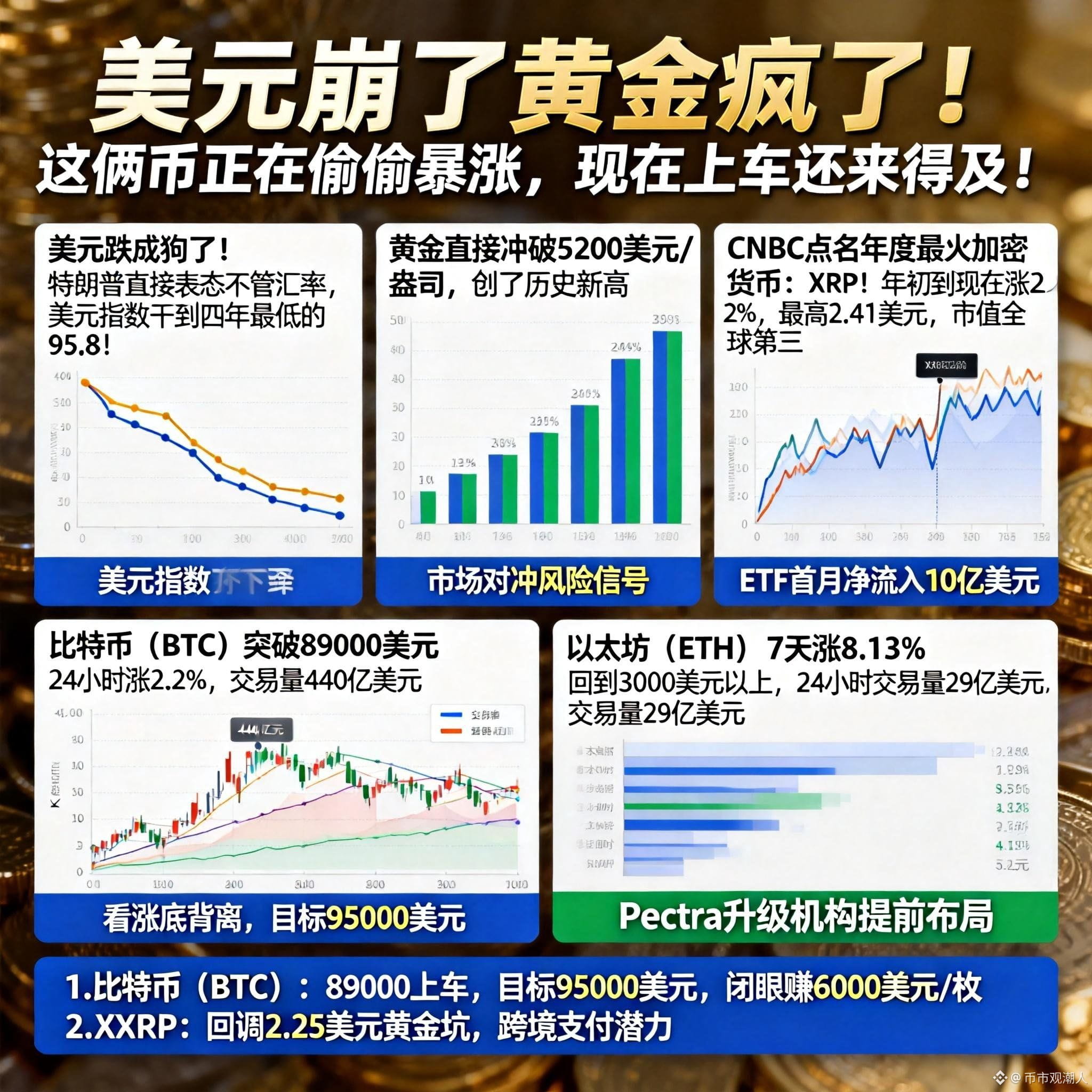 第一个大新闻:美元跌成狗了!特朗普直接表态不管汇率,美元指数干到四年最低的95.8!这意味着什么?钱不值钱了啊!大家都在疯狂找避险资产,黄金直接冲破5200美元/盎司,创了历史新高,这就是最直接的信号——市场在疯狂对冲风险,而加密货币作为“数字黄金”,现在就是风口上的猪!