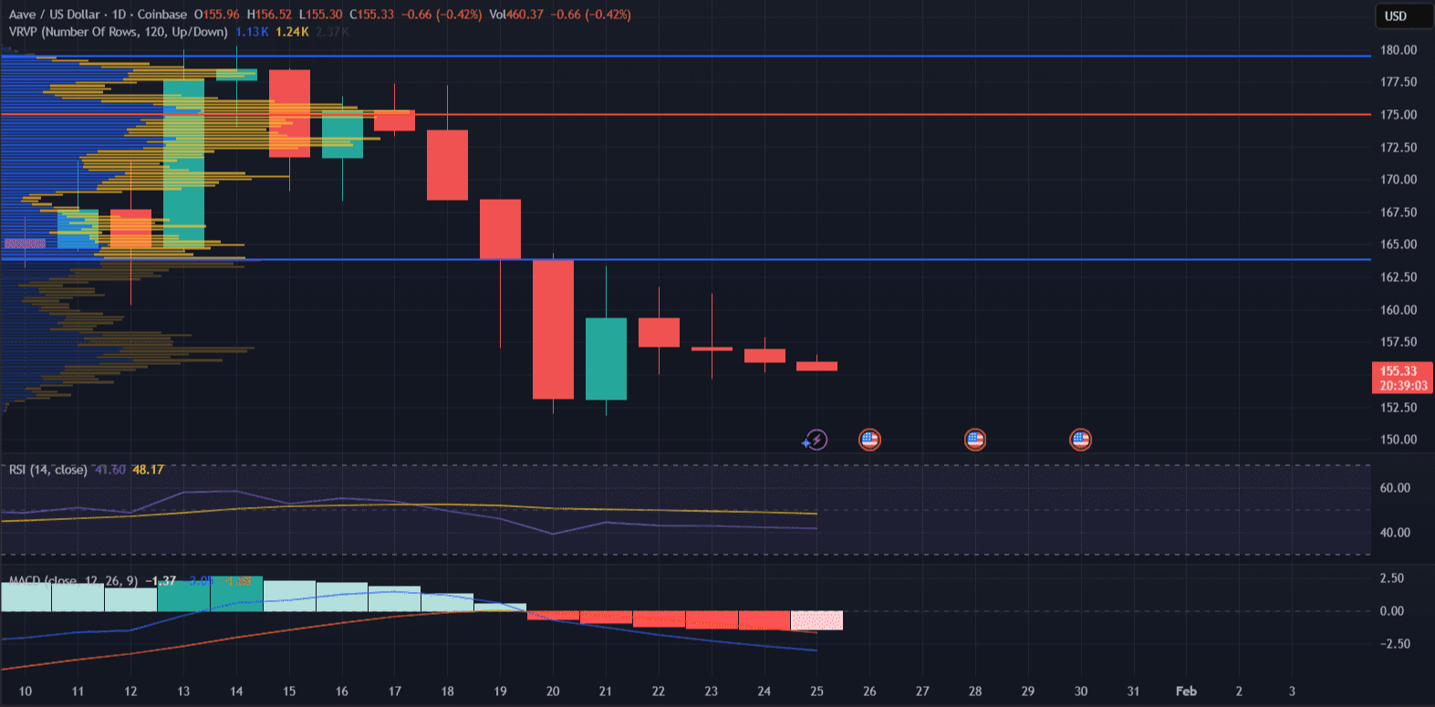 MACD is negative but moving sideways, and RSI is at a neutral level. Strong Volume Profile activity indicates buyers are absorbing selling pressure at lower price levels.