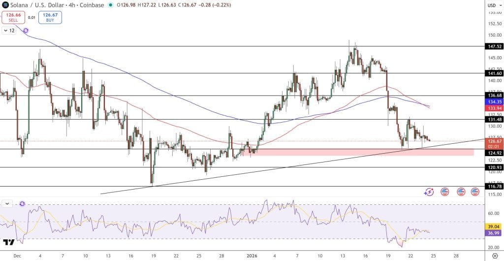 SOL remains below the EMA-50 ($134) and EMA-200 ($136), confirming short-term weakness. RSI is at a low level of 38–40.