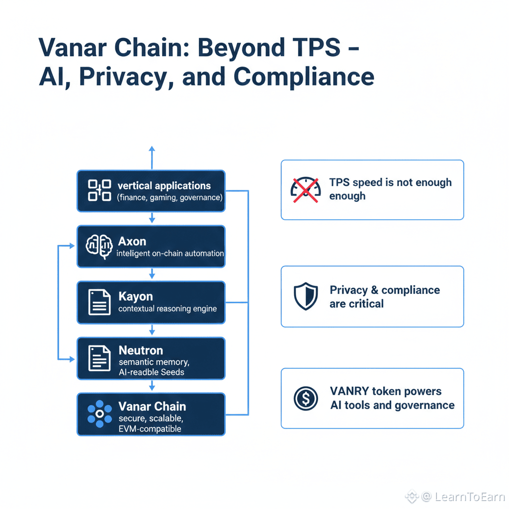Vanar Chain is the first AI-native Layer 1 blockchain built from the ground up to serve the emerging “Intelligence Economy.” Its vision goes beyond simple transaction throughput, providing an entire stack that allows data to be understood semantically, handled privately, and acted upon intelligently. In this ecosystem, TPS matters far less than the ability to process sensitive, high-value information in a secure and compliant way.