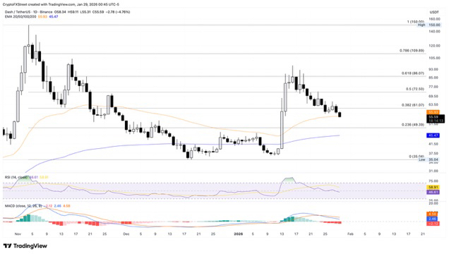 Dash ($DASH ) is facing strong headwinds, having recorded a 3% decline at the time of writing on Thursday, extending the broader decline over the past two weeks which places the 50-day Exponential Moving Average (EMA) at $55.93 in the spotlight. The drop in demand for privacy coins has made these tokens the worst asset class in the cryptocurrency market over the past month. In the case of Dash, the double-digit capital flows observed in the derivatives market due to a significant liquidation of long positions indicate a decrease in investor interest.