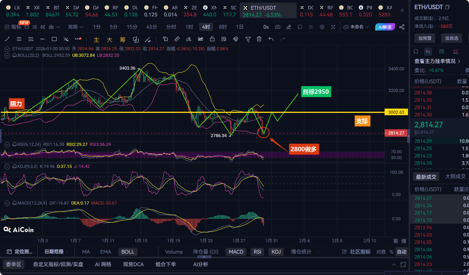 First, let's take a look at the current market: This morning, ETH dropped to a low of 2786 USD and quickly rebounded. It is now firmly standing on the 2800 USD support line, which is not a coincidence. From the 4-hour chart's RSI indicator, it has already touched the oversold edge at 29. The J line of the KDJ has turned upwards directly from a low position, similar to a spring that starts to rebound after being compressed to its tightest point. Looking at the Bollinger Bands, the price has been sticking to the lower band for almost a day, and the lower band has started to flatten out, indicating that the strength of the bears is quickly depleting, while the bulls are secretly gathering strength.