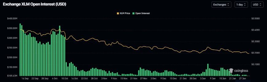Open interest in $XLM futures fell to $106.50 million on Friday and has consistently declined since its peak of $166.99 million on January 6. This decline in open interest reflects a decrease in investor participation and indicates a bearish outlook.