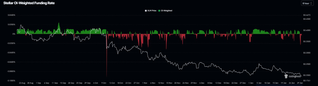 Derivatives data for Stellar supports a bearish outlook. Weighted funding rate data based on open interest from CoinGlass shows that the number of traders betting on a decline in XLM's price is greater than those expecting a price increase. The gauge turned negative on Thursday and stands at -0.0049% on Friday, indicating that short positions are paying long positions and suggesting bearish sentiment towards XLM.
