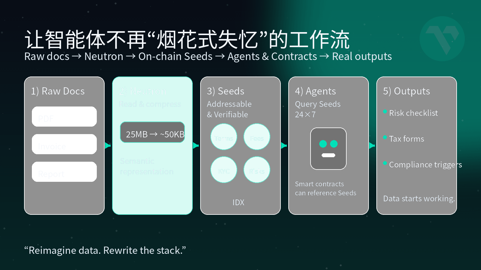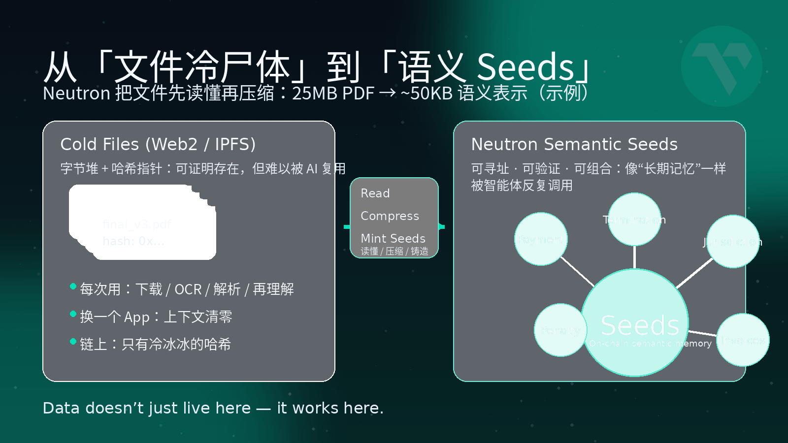 Vanar's answer is called Neutron. It straightforwardly does not position itself as 'another storage solution', but very directly states: this is a Semantic Memory Layer—semantic memory layer. In layman's terms, Neutron does two things. The first step is to 'understand' the file and then compress it. It does not simply zip up a PDF, but first uses semantic and heuristic methods to cut the original file into meaningful segments, then reconstructs it into a new representation; it compresses 'information redundancy' and 'expression form', not the content itself. You give it a 25MB PDF, and after understanding the content, it can compress the core semantics into a representation of about 50KB, while keeping your information, context, and structure intact. The second step is to forge this understanding into individual Seeds—'knowledge seeds' that can be understood by AI and referenced by contracts. Neutron no longer treats files as a blob, but breaks them into many Seeds, each of which is an independent, addressable, verifiable semantic unit, and is directly on-chain, rather than a half-baked solution of 'off-chain storing files + on-chain placing pointers'.