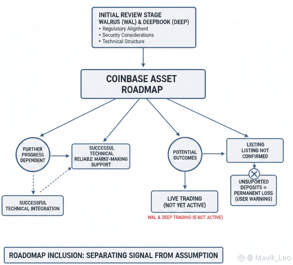 The appearance of Walrus and DeepBook on Coinbase’s roadmap is a constructive signal, but not a guarantee of anything further. Until official listing announcements, supported trading pairs, and liquidity readiness are confirmed, both assets remain in an evaluation phase.