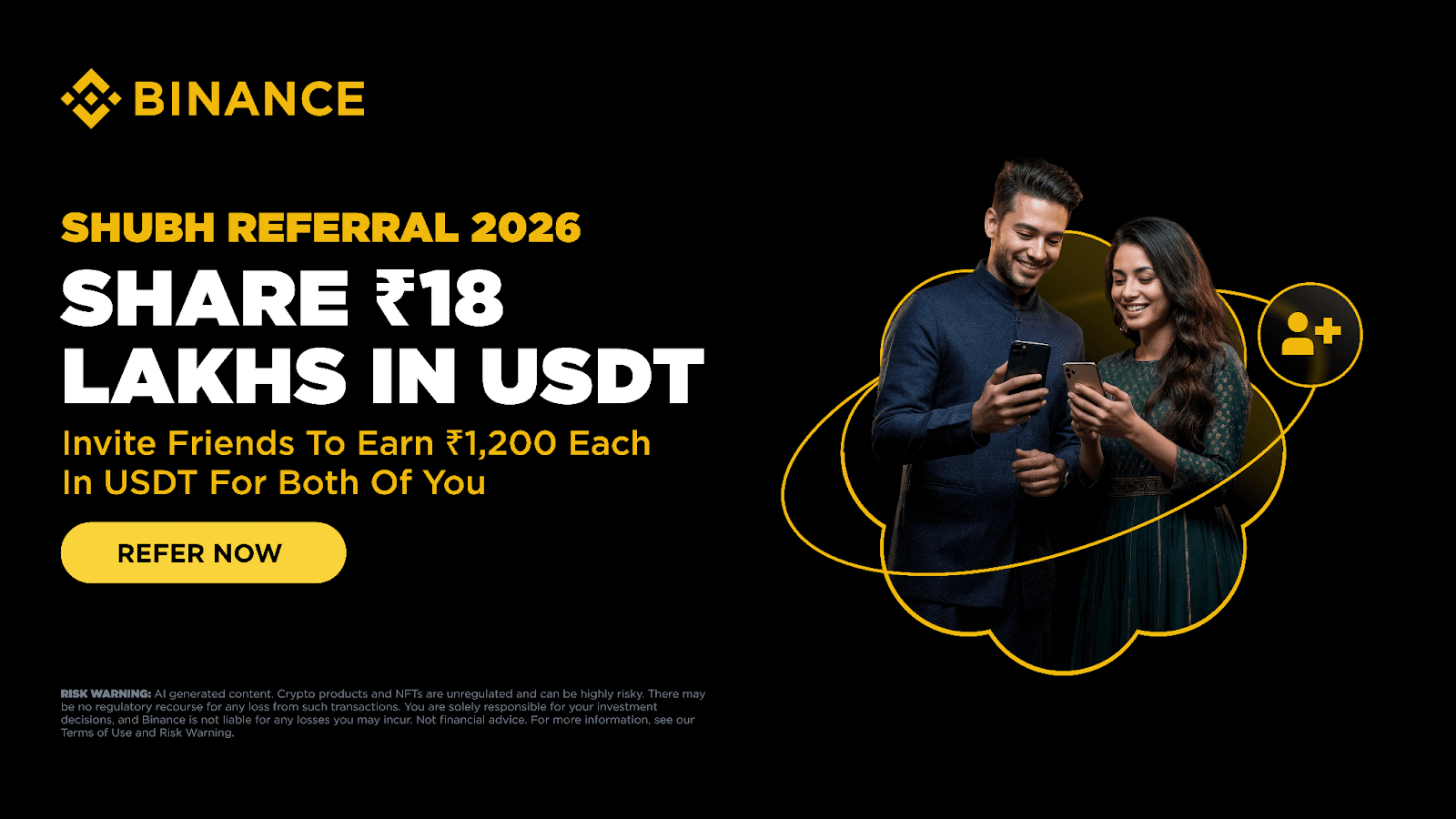 Join us in kicking off 2026 with an exclusive 5-day promotion - the second edition of Shubh Referral! Earn your share of ~₹18 Lakhs in USDT by inviting your friends and family to sign up, make their first deposit, and trade on Binance.