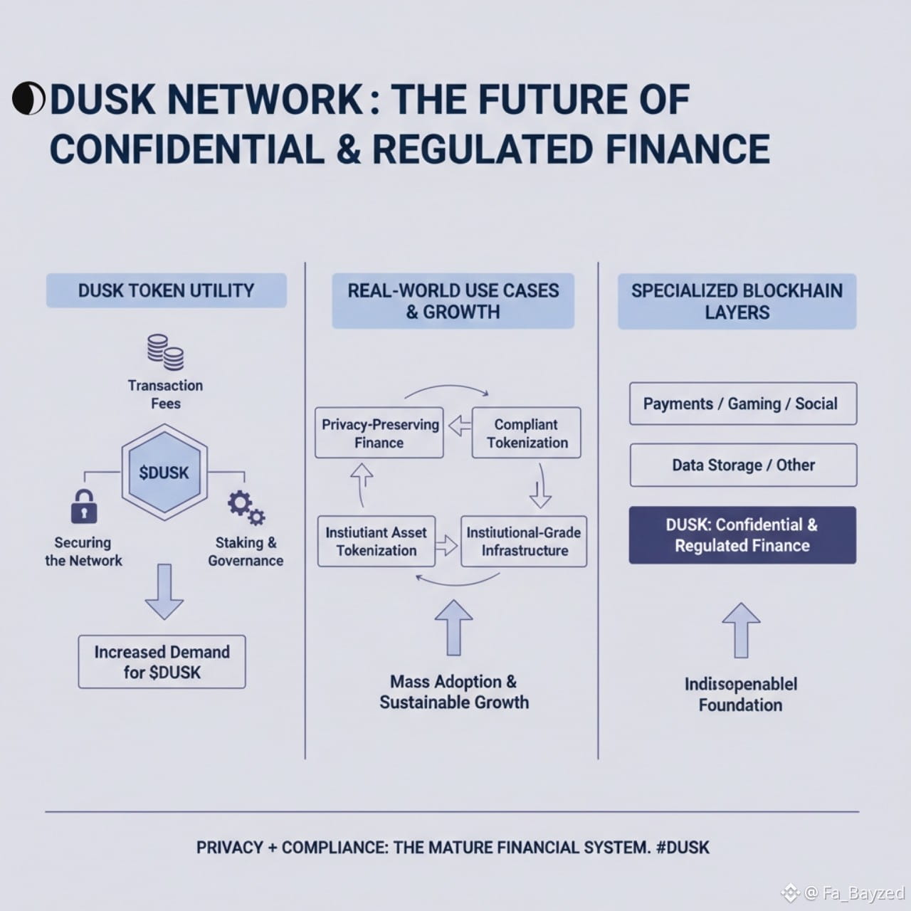 The future of blockchain will likely be multi-layered. Some networks will specialize in payments. Others will focus on gaming, social platforms, or data storage. Dusk is carving out a specialized role as the foundation for confidential and regulated financial applications. This specialization is not a weakness; it is a strength. By focusing deeply on one of the most complex areas of blockchain, Dusk increases its chances of becoming indispensable.