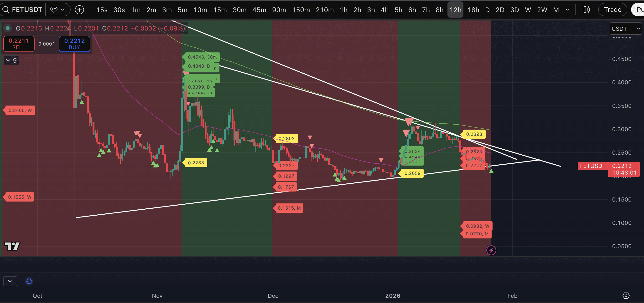 "More broadly, since the end of October, most assets have formed a Bullish Wedge. This shouldn't be ignored, even though the initially vigorous breakout from the pattern in January fizzled out. There are, of course, exceptions, like FET, which has been forming a Triangle since the fall and is now on the verge of breaking below it, with a target somewhere below zero."