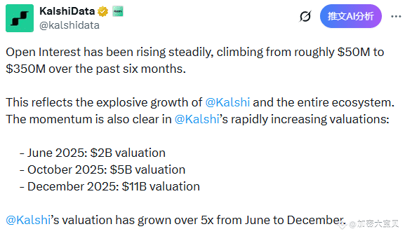 在这样的业务基础上,Kalshi的估值从6月的20亿 → 到10月的50亿 → 再到12月的110亿,六个月内放大超过5倍。