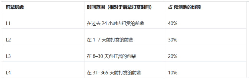 For each paid donation from a junior member, the prediction pool amount will be divided into four tiers based on the time window, with each tier having a different proportion, as follows:
