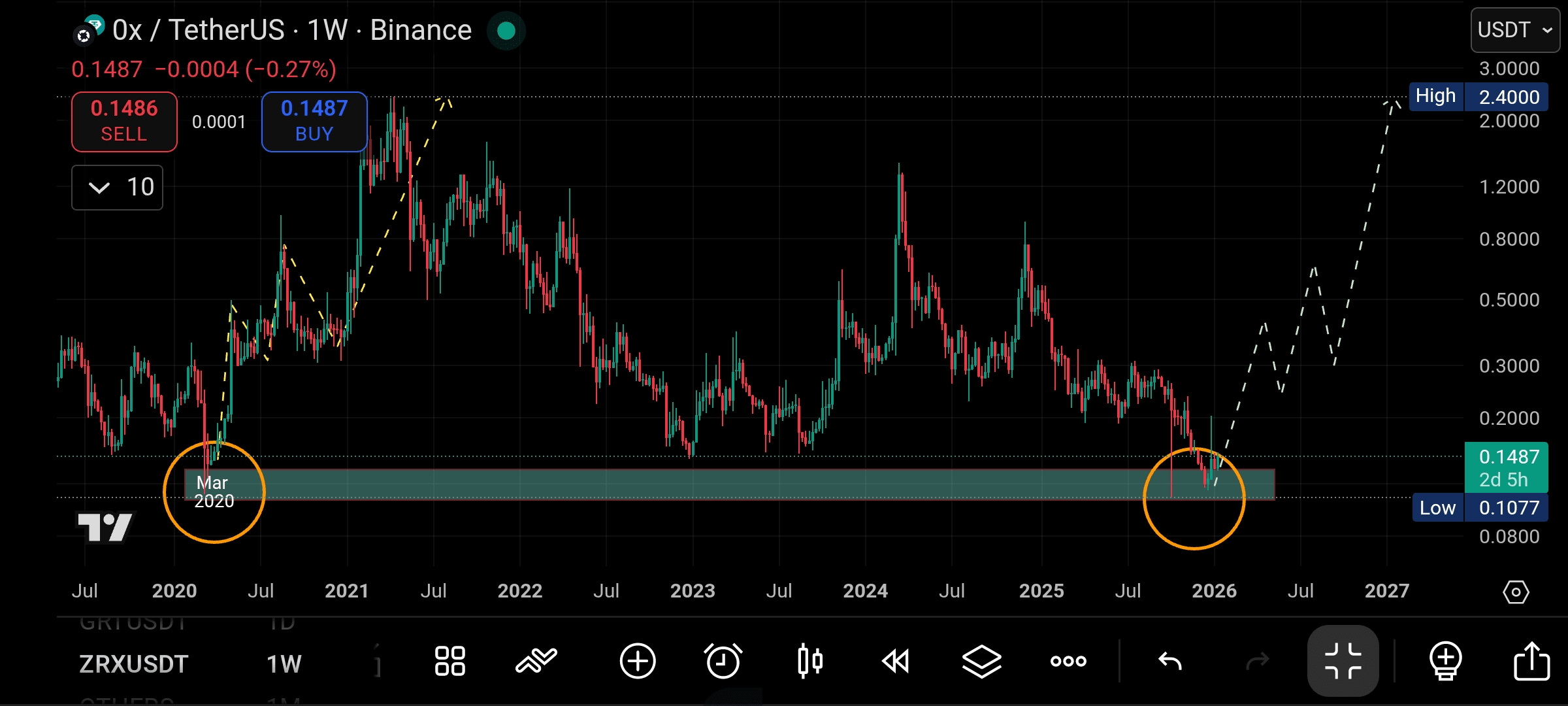 Looking at the chart, it tells us that we have finished the violent decline and we are now at the beginning of an upward wave targeting +1000%.