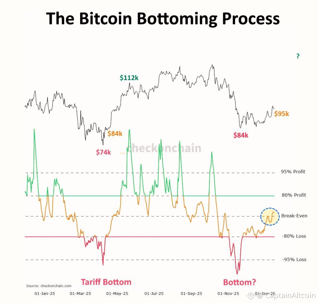 Earlier in the year, the BTC price fell hard from above $100,000 into the $74,000 to $84,000 zone. That drop pushed short-term holders deep into loss territory, even close to the extreme -95% loss level. This was the phase labeled as the “tariff bottom,” where forced selling peaked and fear clearly took control.