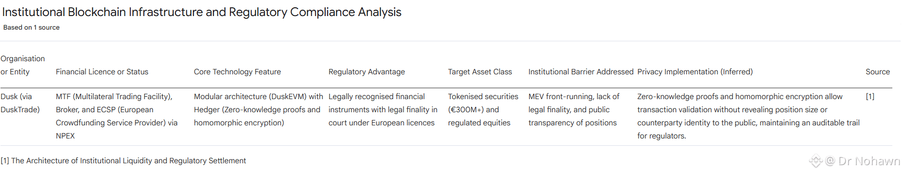 Let’s break down why those acronyms are worth more than high TPS metrics. An MTF license essentially allows the platform to operate as a regulated trading venue, similar to a stock exchange. This means that when Dusk Trade brings €300M+ in tokenized securities on-chain, those assets aren't just synthetic tokens floating in a legal grey area. They are legally recognized financial instruments settled on a blockchain that was built to handle them.