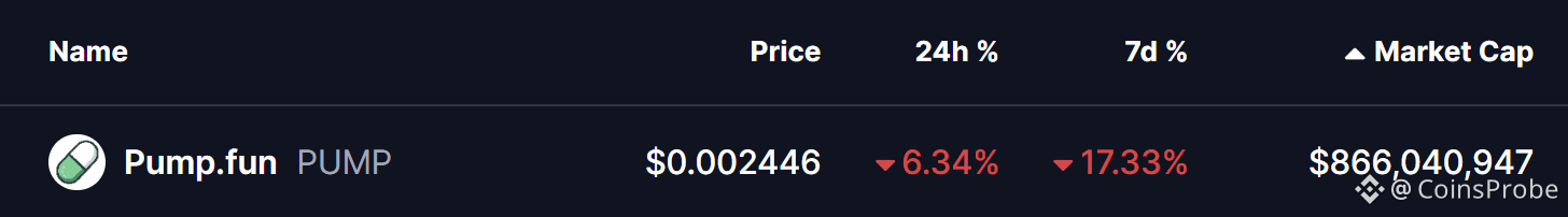 PUMP, the native token of the Pump.fun launchpad, is under short-term pressure, slipping nearly 6% today and extending its weekly decline to around 17%. While price action may look weak on the surface, a closer look at on-chain data and the daily chart reveals a more interesting story unfolding beneath the pullback.