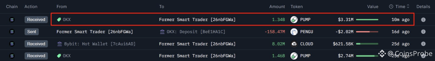 According to the latest data shared by @OnchainLens, a smart whale has once again increased exposure to PUMP. The whale recently withdrew an additional 1.34 billion PUMP tokens, worth approximately $3.31 million, from OKX.