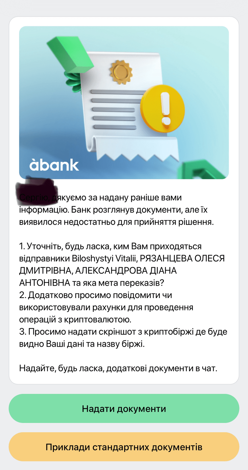 They requested additional information: who the senders are, what the purpose of the transfers is, whether it is related to crypto, plus screenshots from the exchange. Okay — I sent it again, already expanded. Now I am waiting for a decision.