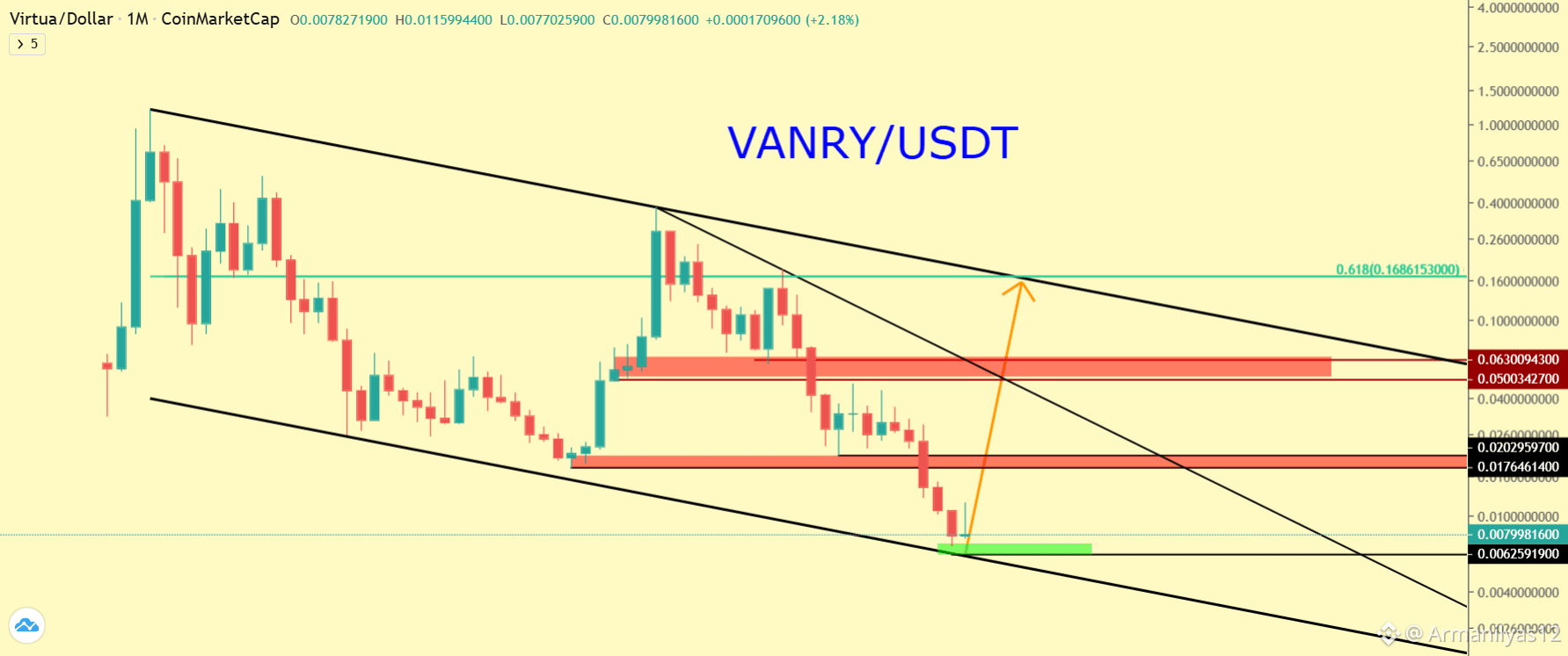 Current price: $0.0080, trading inside a descending channel with support at $0.0081.