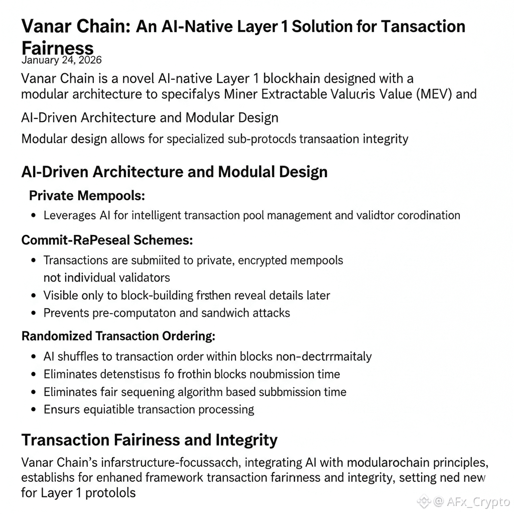 #Vanar Chain represents a new generation of AI-native Layer 1 blockchains, designed to seamlessly integrate artificial intelligence with decentralized applications. By combining the scalability and security of a modular blockchain with AI-driven analytical capabilities, Vanar Chain seeks to address some of the most pressing challenges in decentralized finance (DeFi) and Web3 ecosystems, including Miner Extractable Value (MEV), front-running, and fraud detection.