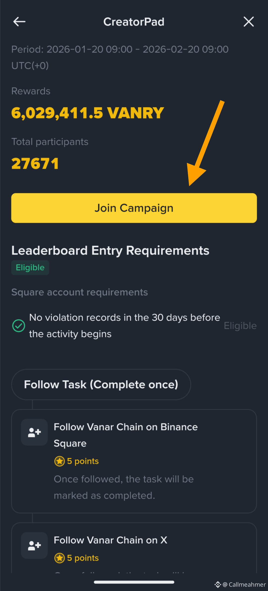 After making sure your X ( Twitter) is connected click on join campaign. After that you have to follow the project you're going to grind on both Binance Square and on X(Twitter) have in mind that thses are mandatory tasks if you ignore them then you'll be disqualified.