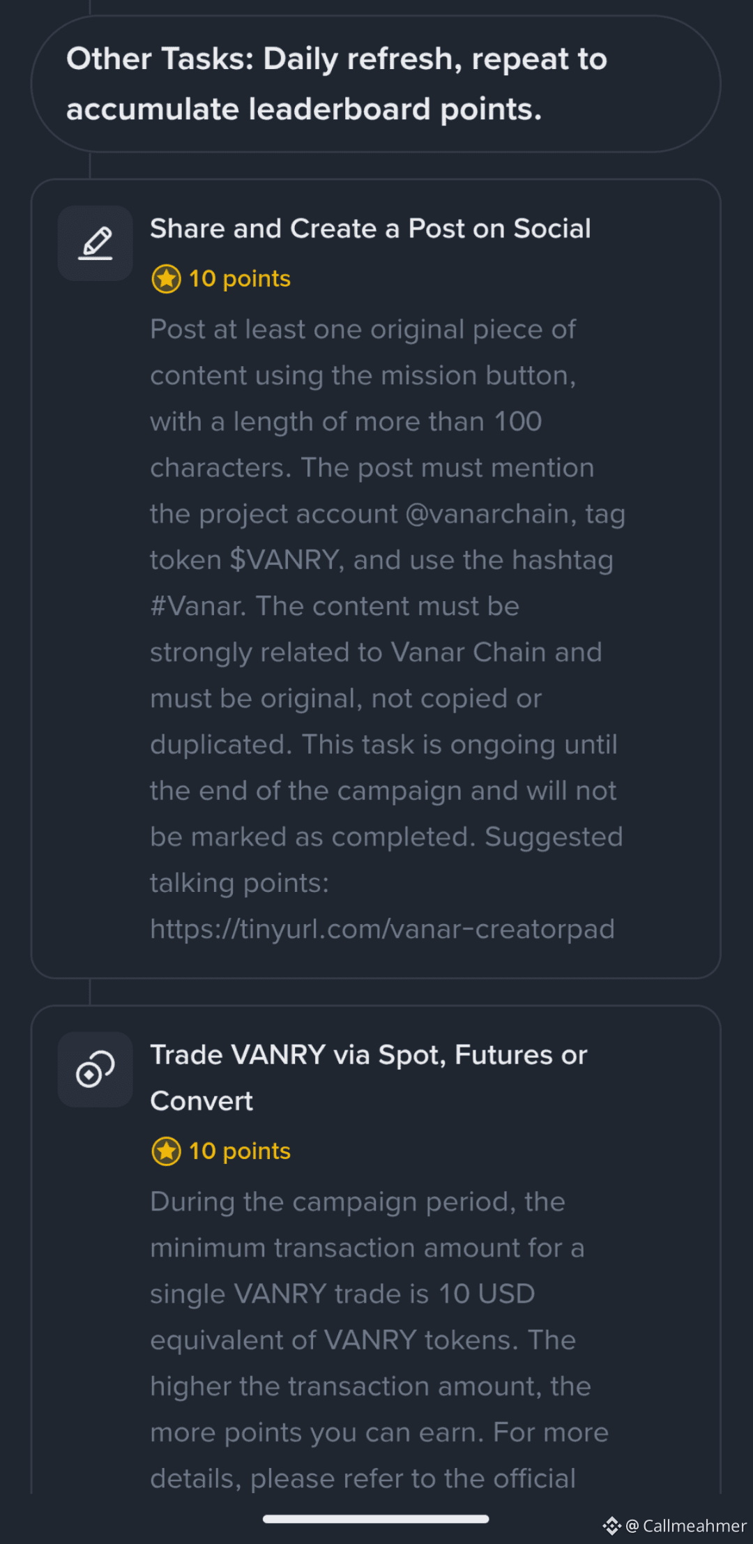 These are the last two steps and yes you will have to do these daily too write about exp $VANRY probably on X and as discussed above make sure your post follow community guidelines and your post contains at least 100 characters