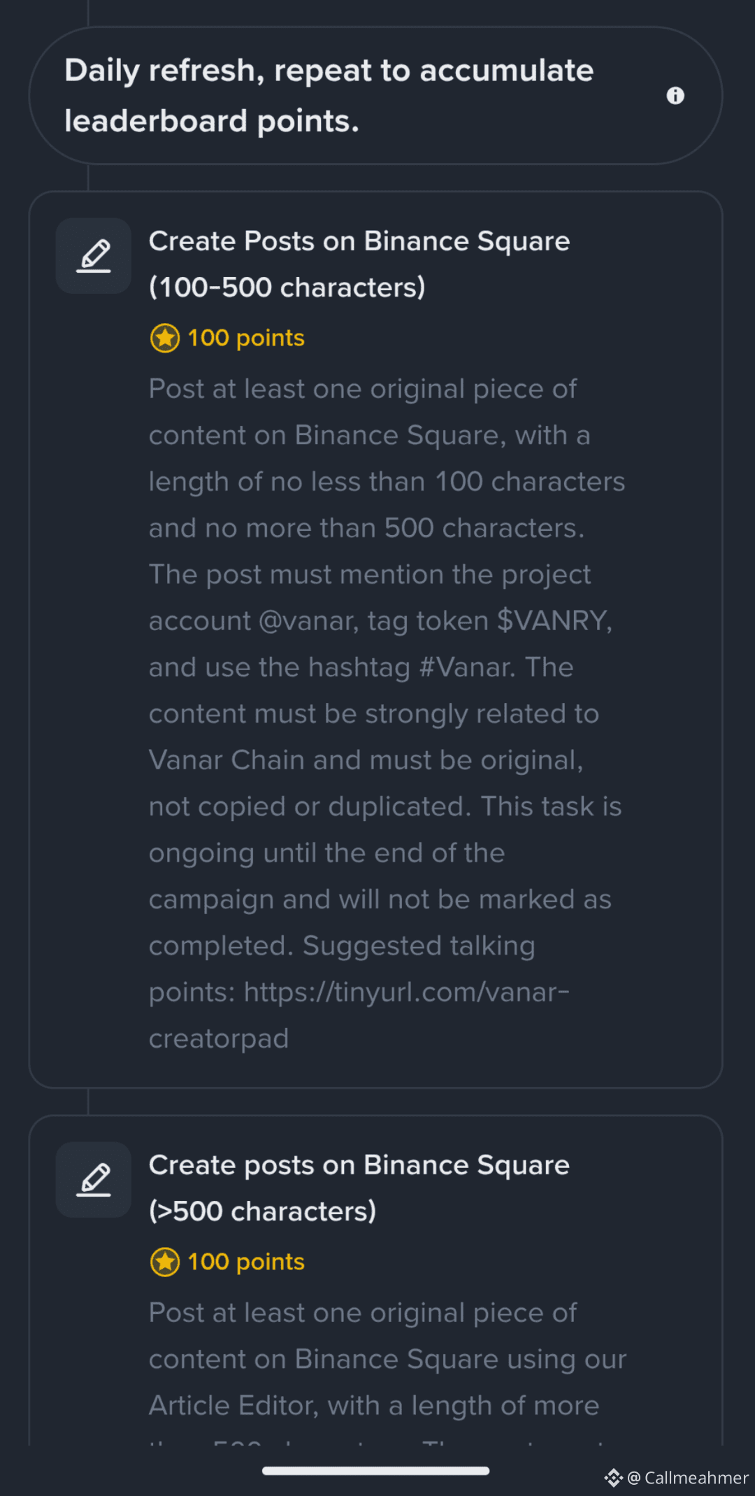 Now you're half way there these are daily tasks meaning you have to do all of these tasks daily so create an article about the project you're grinding on and make sure you write โ๏ธ at least 100 to 500 characters so your post will be considered eligible and make sure to do your research don't rely on ai learn and talk about that project yourself and make sure you follow the rules