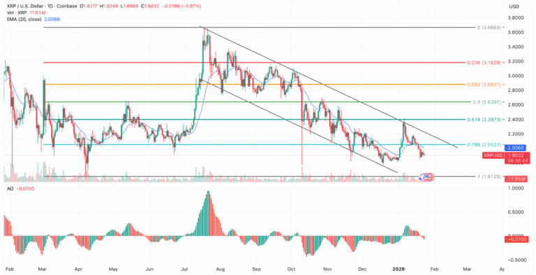 XRP is stuck in a downtrend channel, trading below the 20-day EMA.
