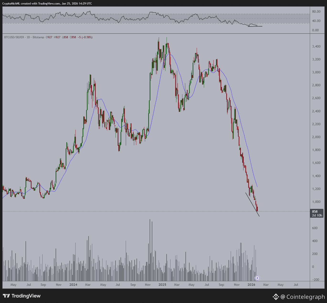 BTC/XAG three-day chart with RSI, volume data. Source: Michaël van de Poppe/X