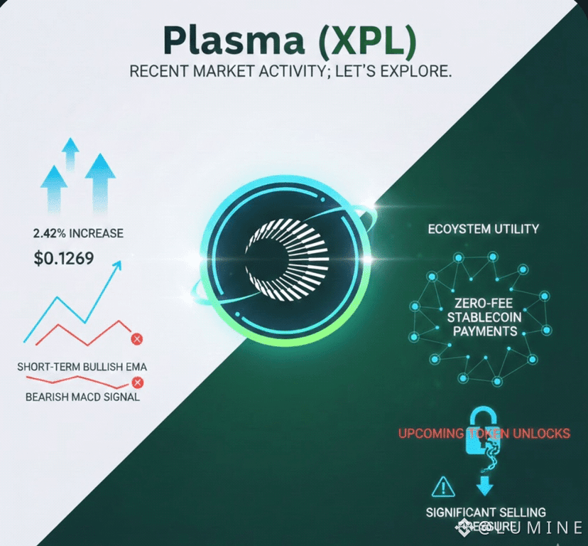 In a market often driven by noise, narratives, and short lived hype cycles, Plasma (XPL) has been quietly positioning itself as something different: an infrastructure-first project designed to solve real payment friction rather than chase speculative attention. At the time of writing, Plasma (XPL) is trading at $0.1269, marking a 2.42% increase over the last 24 hours. That price movement may seem modest on the surface, but beneath it lies a layered story of technical signals, ecosystem ambition, and looming token dynamics that deserve closer inspection.